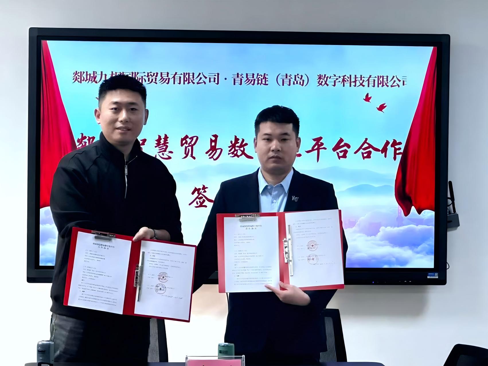 10月28日,青易链团队赴郯城县开展商务考察,与山东沂蒙兴业产业投资集团有限公司举行深度合作洽谈。郯城县商务局副局长韩玉、沂蒙产投集团董事长潘月强出席签约仪式,双方正式签署平台落地合作协议,并就平台部署、企业引入及贸易合作等后续业务流程达成共识。